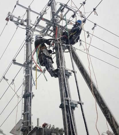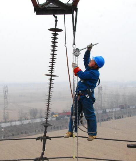 電力設(shè)施檢修電力工人攜帶鋁合金手扳葫蘆檢修作業(yè)...
